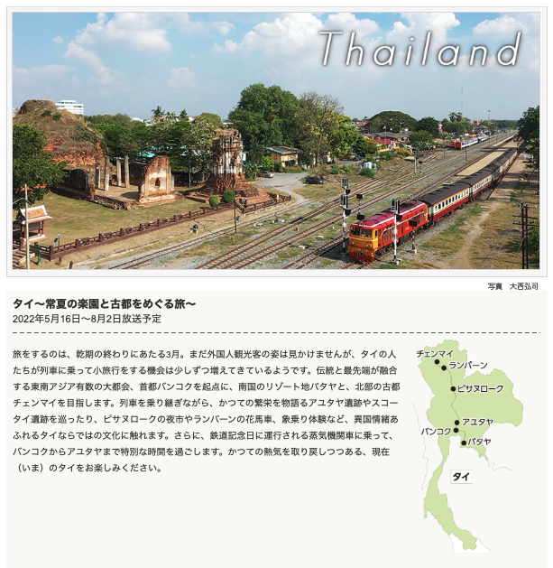 2022年5月16日から8月2日までテレビ朝日様で放送される。「世界の車窓から」の番組で使用するドローン映像撮影を担当しました。